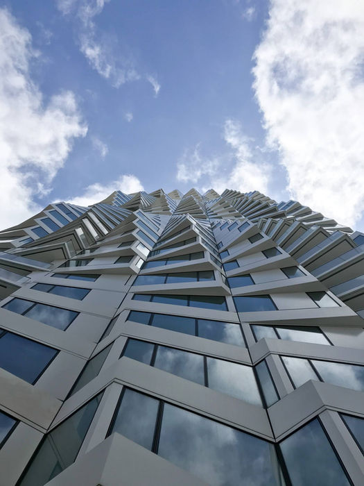 Working with the architects, a tenable enclosure system was developed consisting of only three wall types for such radical geometry: three-dimensional opaque cover panels at the slab edge, infill vision and spandrel units, and a window wall at the balcony conditions. The most dominant and technically challenging component of the wall are the three-dimensional cover panels with their varying shapes, sizes, and changing interface conditions. Each panel was made from a massive single sheet of aluminum folded and welded into the various configurations needed by the project. The rippling effect of the facade relies on the uniformity of these panels between each other, and from bay type to bay type. Regardless of the variation, each panel fits within the 14-foot-wide building module, allowing them to shift seamlessly in relation to the other components, and ultimately create the mesmerizing effect Studio Gang was looking for. Full-scale mock-ups of these panels, along with mullion profiles and glass types, were reviewed from an early stage to confirm both the architectural and technical implications of the proposed design.